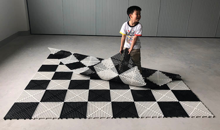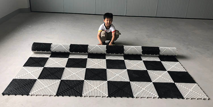 Tablero de ajedrez para ajedrez de jardín o damas (también conocido como ajedrez de exterior o de parque), fabricado en plástico/caucho. El tablero se compone de campos individuales de 30 x 30 cm, que se ensamblan en un todo mediante broches especiales. Como cada campo está hecho de una malla de goma especial, es 100% resistente a la intemperie. Esto ofrece muchas posibilidades, por ejemplo, cuando empieza a llover, sin miedo a que el agua dañe el tablero de ajedrez se puede terminar la partida más tarde. El tablero de ajedrez es ideal para nuestras figuras y peones de damas de jardín.