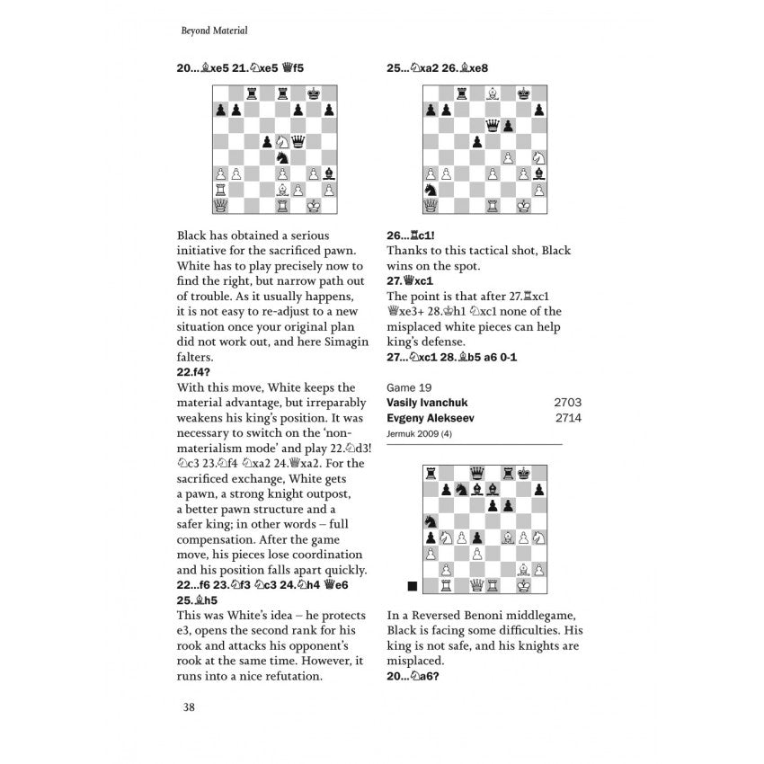 Los jugadores de club modernos deben ser capaces de reprimir su necesidad de gratificación inmediata. Para ganar ventaja, a menudo hay que conformarse con una compensación incierta. Con la ayuda de muchos ejemplos fascinantes, Kuljasevic te enseña la habilidad esencial de asumir riesgos calculados. Después de estudiar Beyond Material, ganar partidas sacrificando material se convertirá en algo natural para ti.