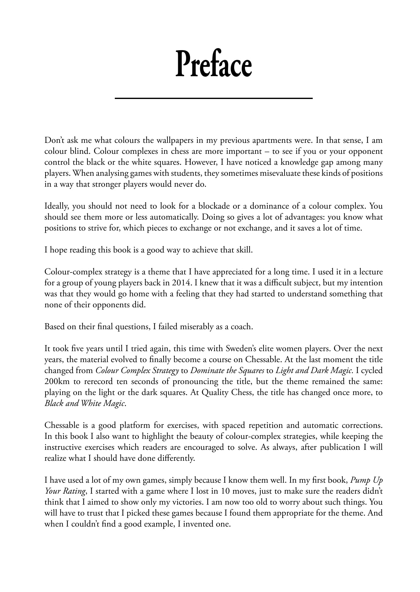 Durante su larga trayectoria como ajedrecista y entrenador, el GM Axel Smith llegó a la conclusión de que la comprensión de las estrategias complejas de color es una de las diferencias clave entre los jugadores fuertes y los débiles. Tras muchos años de impartir conferencias y material de entrenamiento a sus alumnos, Smith elaboró un curso Chessable sobre el tema, que ha sido ampliamente editado y reorganizado por Quality Chess para producir este libro.