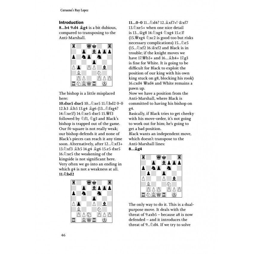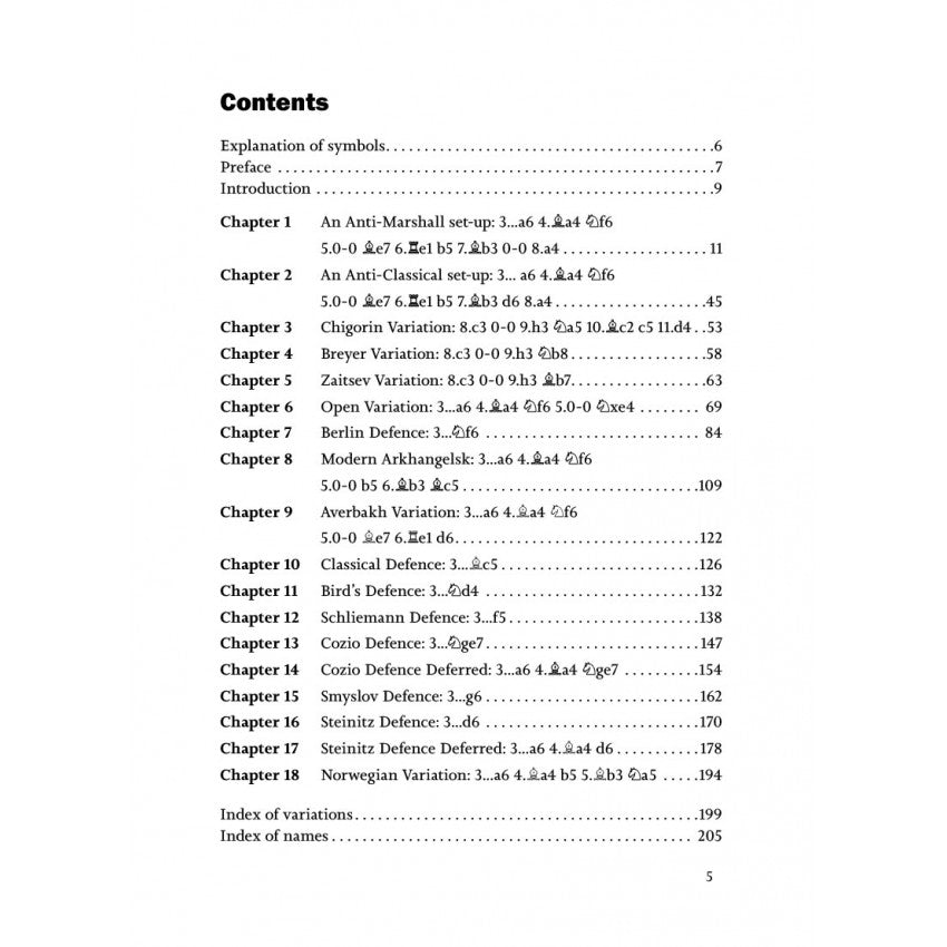 Este repertorio, claro y conciso, abarca quince variantes principales, desde las líneas clásicas hasta la antimarshall (8.a4), y desde la Schliemann (3…f5) hasta la Steinitz moderna. De una manera fácil de entender, Caruana explica las características generales, como las debilidades permanentes y los objetivos a largo plazo, y siempre busca una ventaja para las blancas.