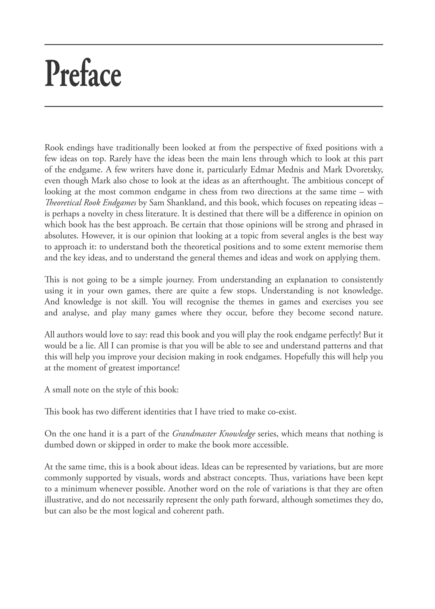 Conceptual Rook Endgames va en una dirección diferente. Centrado en dos docenas de conceptos principales, el libro explica los mecanismos de los finales de torre de una forma novedosa, construyendo los cimientos con ejemplos sencillos, que pueden verse también en los ejemplos más complicados. Los finales de torre seguirán siendo ricos y sorprendentes, como lo son para los grandes, pero armado con este libro, su comprensión de los mismos se disparará.