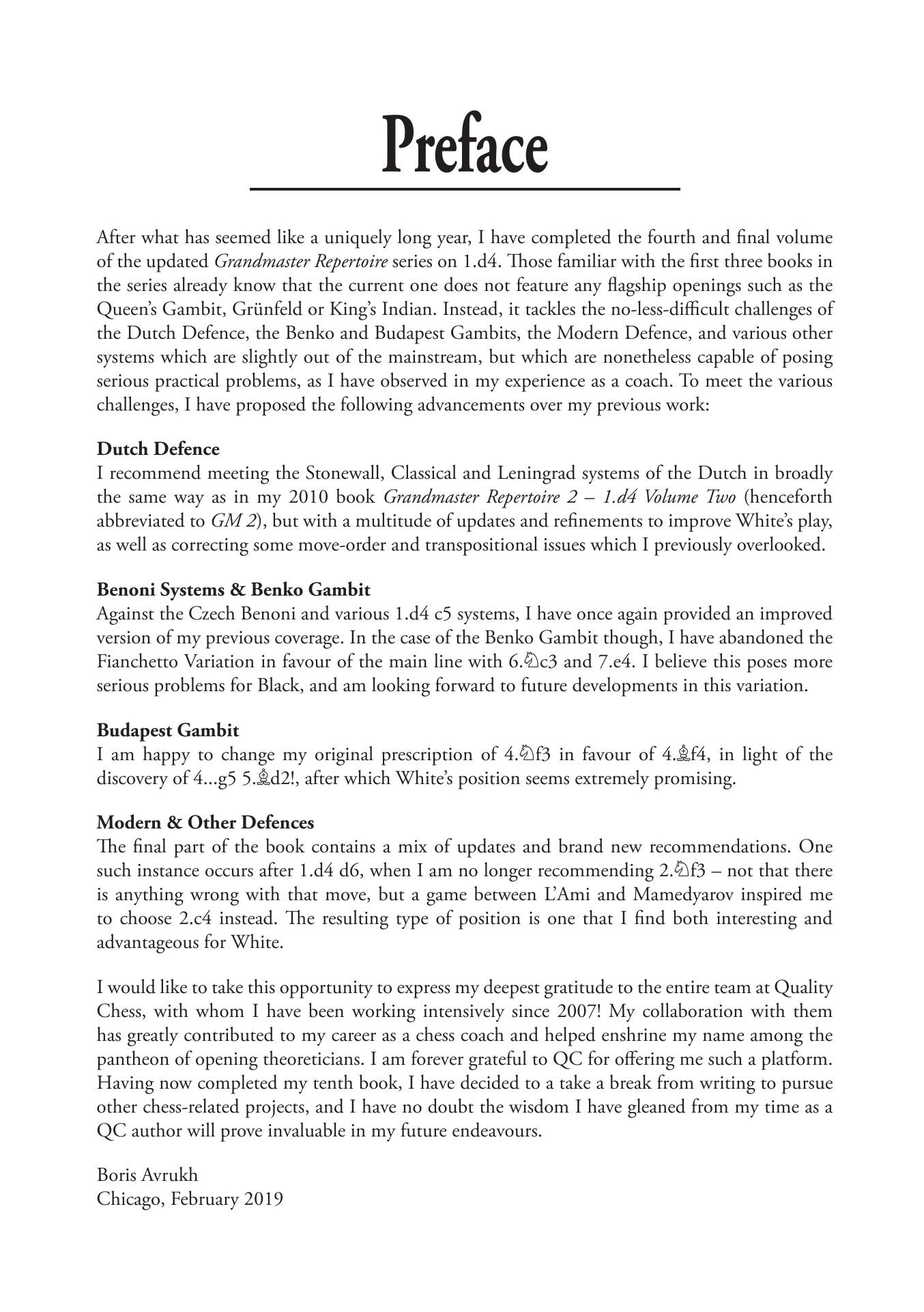 Cuando Boris Avrukh publicó sus libros de repertorio de 1.d4 en 2008 y 2010, causaron sensación. El GM Michael Adams comentó que "la serie de alta calidad Grandmaster Repertoire ha llevado este formato a un nivel completamente diferente". La recién renovada serie 1.d4 de Avrukh ha subido aún más el listón.