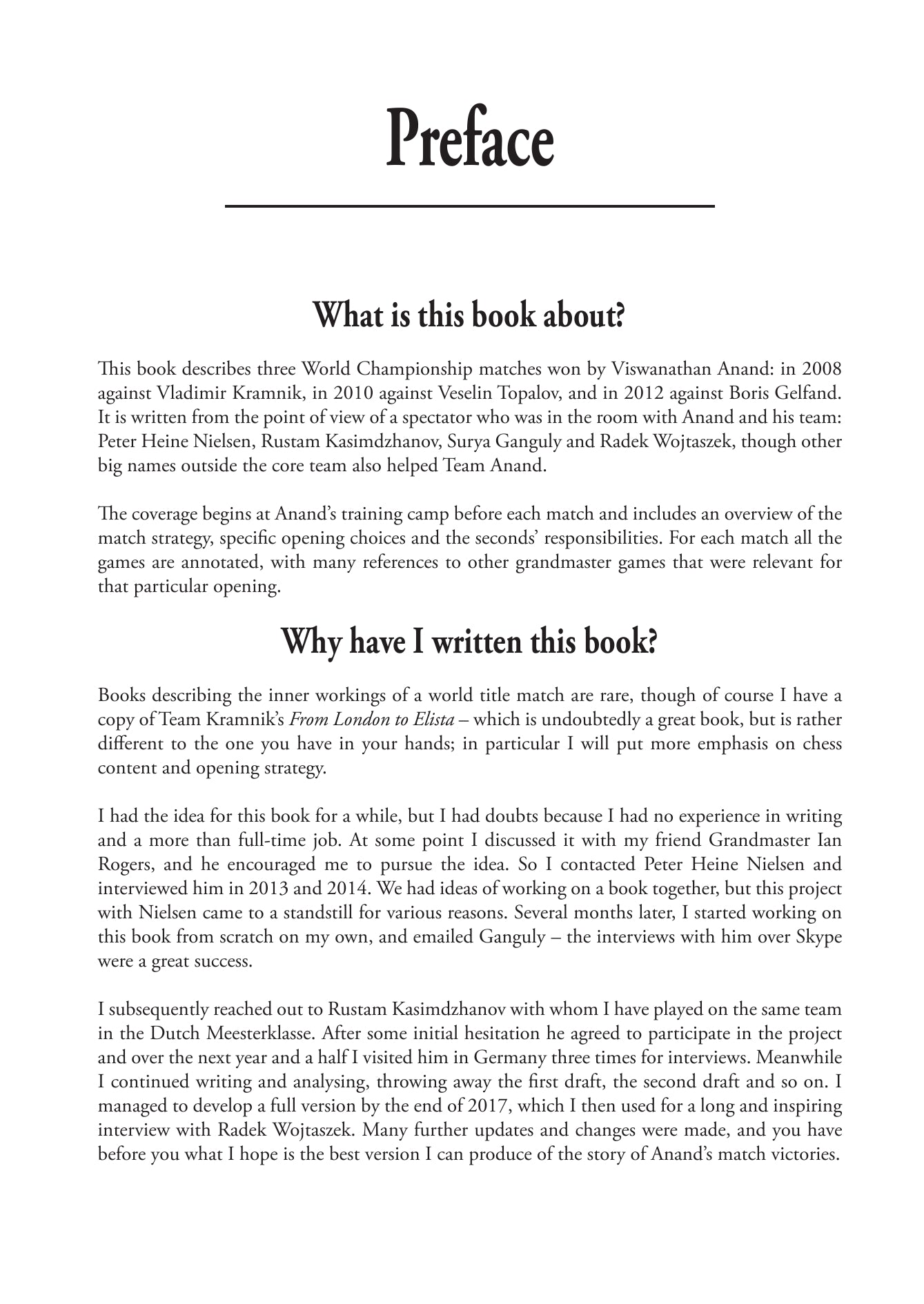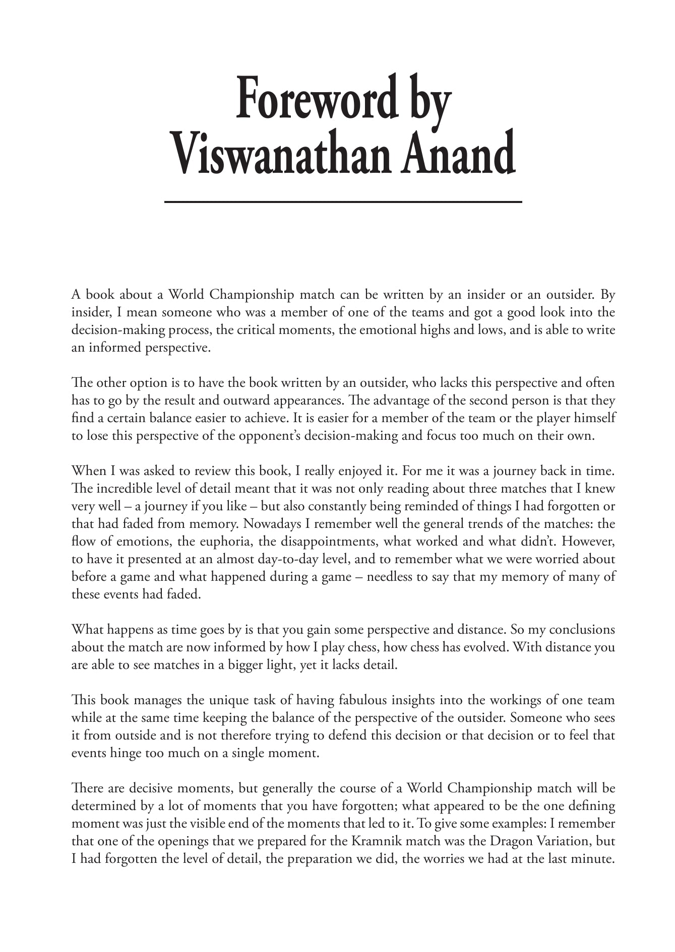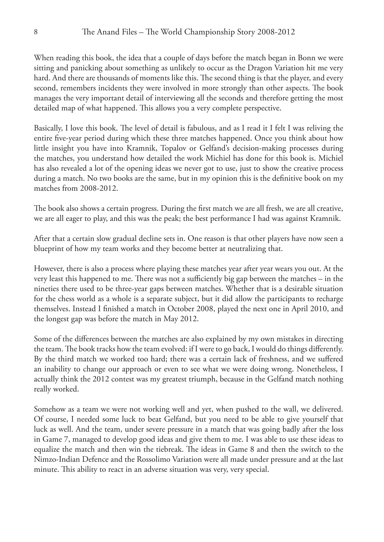 "La historia del campeonato mundial de ajedrez me fascina desde hace mucho tiempo y el contenido de este libro es sumamente interesante. Es maravilloso poder ocupar el lugar de una mosca en un muro histórico para ver cómo se preparaba Anand para los tres grandes matches."