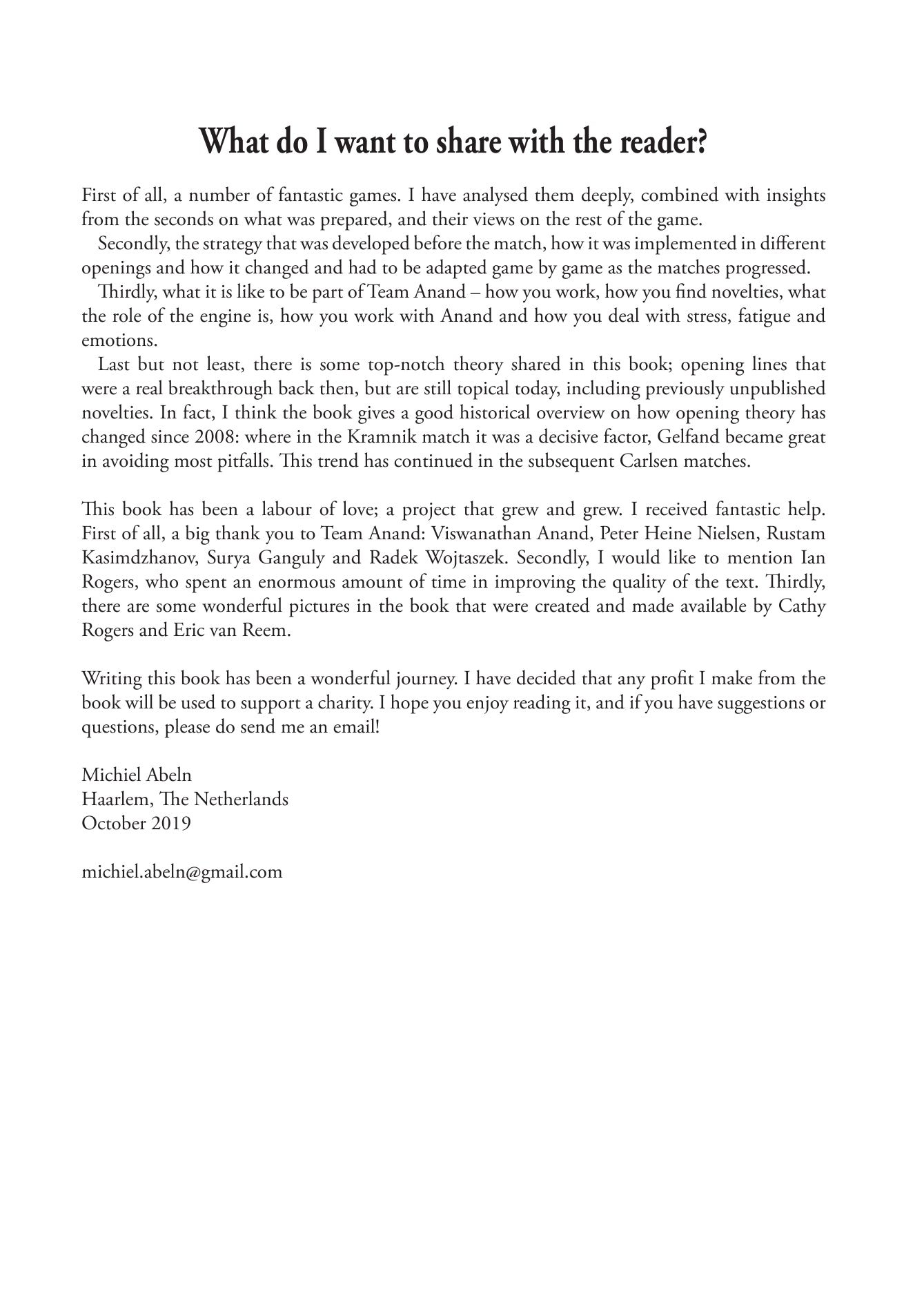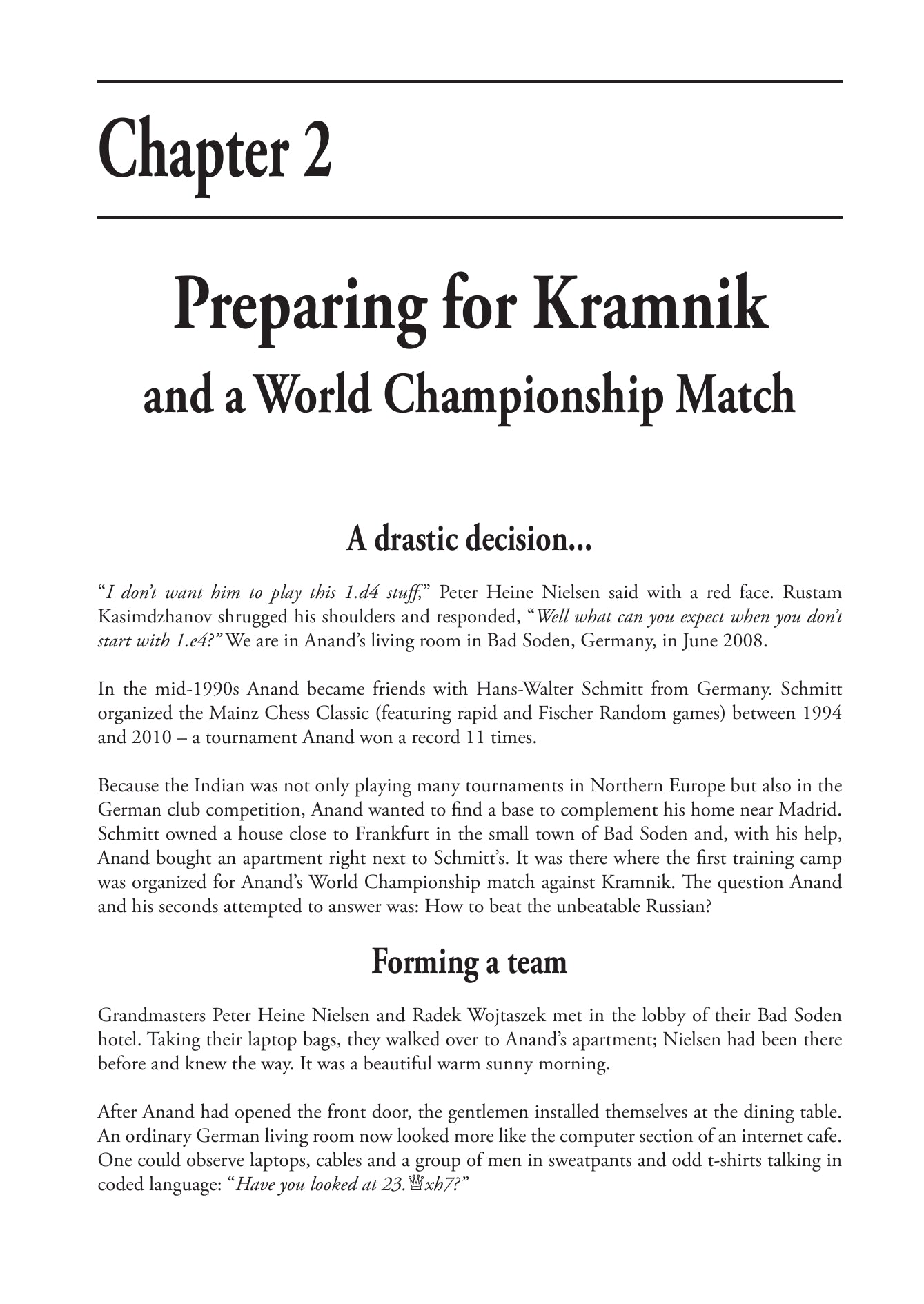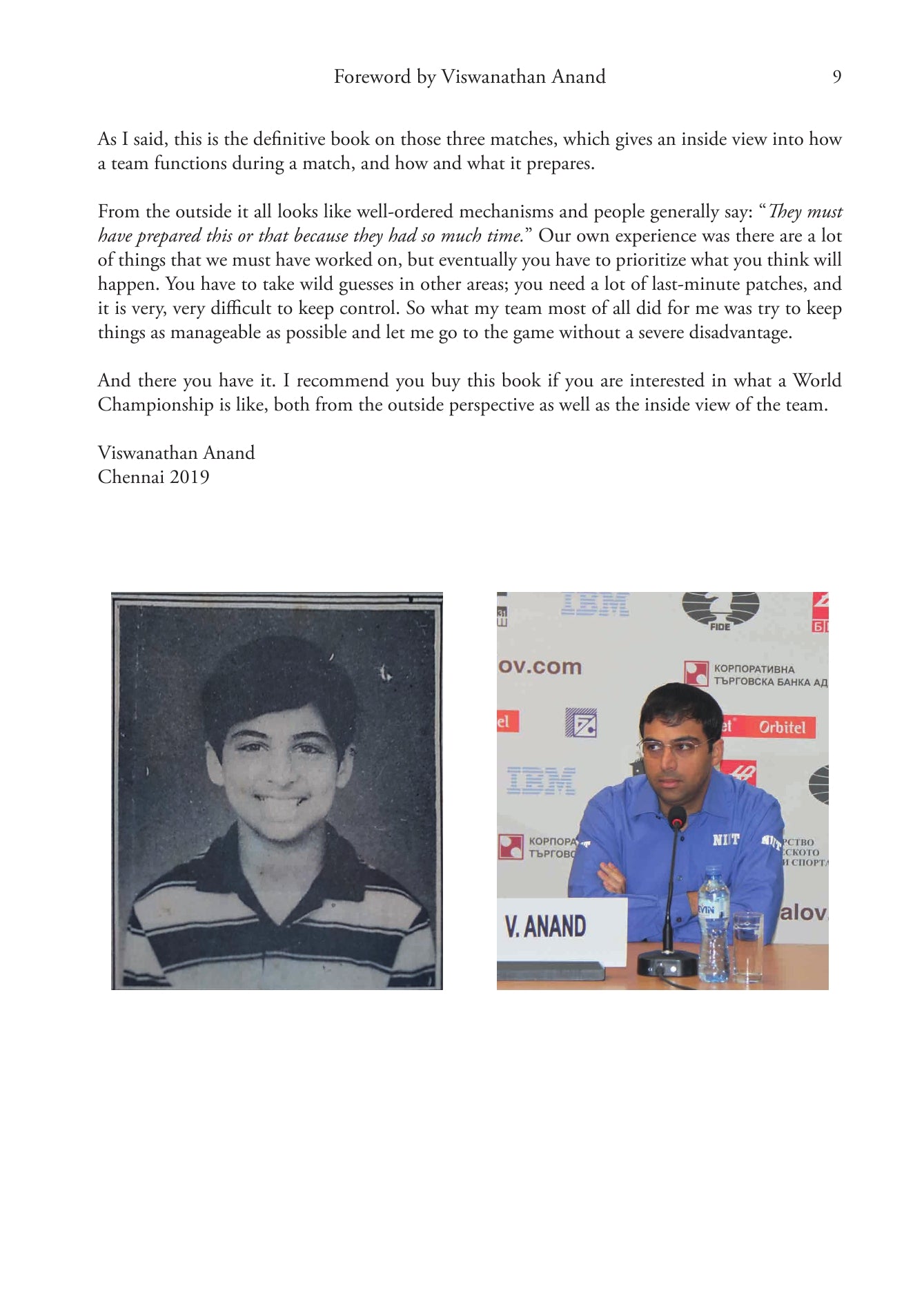 "La historia del campeonato mundial de ajedrez me fascina desde hace mucho tiempo y el contenido de este libro es sumamente interesante. Es maravilloso poder ocupar el lugar de una mosca en un muro histórico para ver cómo se preparaba Anand para los tres grandes matches."