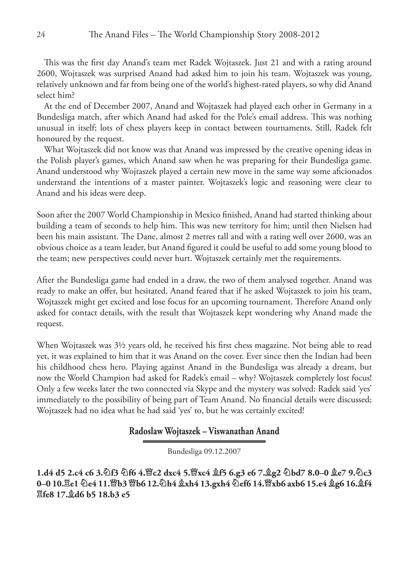 The Anand Files ofrece una visión detallada de las estrategias que Viswanathan Anand utilizó para ganar tres Campeonatos del Mundo consecutivos. Lleva al lector entre bastidores para mostrar el funcionamiento interno del equipo Anand, incluida la planificación previa a la partida y la preparación de novedades en las aperturas, algunas de las cuales aún no se han utilizado.