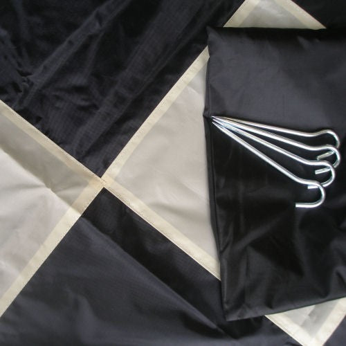 Versi?n econ?mica de tablero de ajedrez para piezas de ajedrez gigantes hecha de tela de nylon que se asemeja a una lona. El tablero de ajedrez se empaqueta en una bolsa de nylon. Las clavijas para adjuntarlo al suelo est?n incluidas. El tama?o cuadrado de 32 cm permite un juego c?modo.